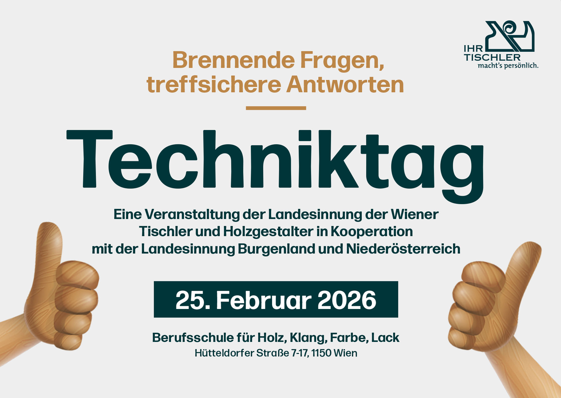 Die Landesinnungen der Tischler und Holzgestalter aus Niederösterreich, Burgenland und Wien laden herzlich zum gemeinsamen Techniktag ein: